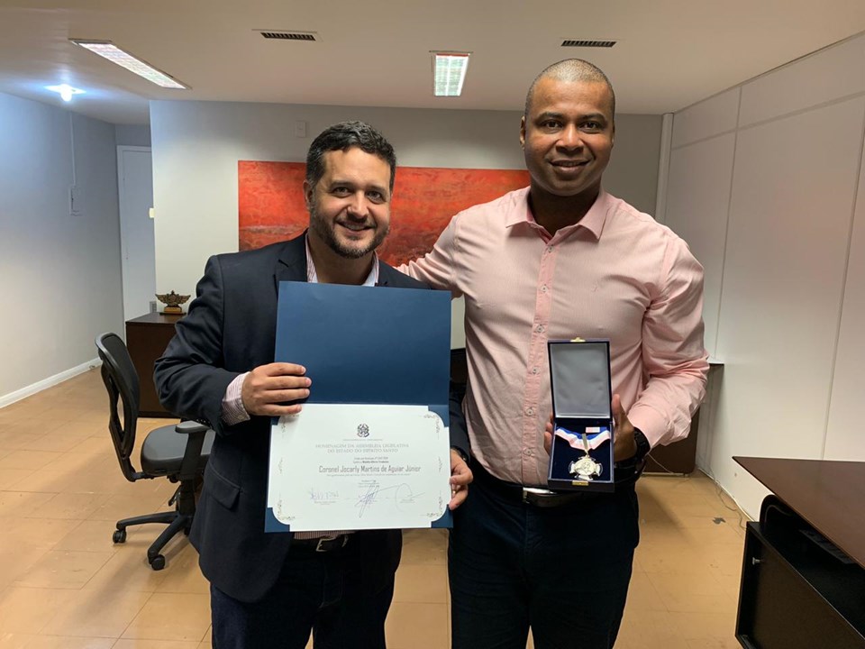 O Secretário-Chefe da Casa Militar, Coronel Aguiar, recebeu na manhã desta sexta-feira (07), em seu gabinete, localizado no Palácio Fonte Grande, a comenda “Medalha Alferes Tiradentes”, concedida por meio de indicação do Deputado Estadual Fabrício Gandini.